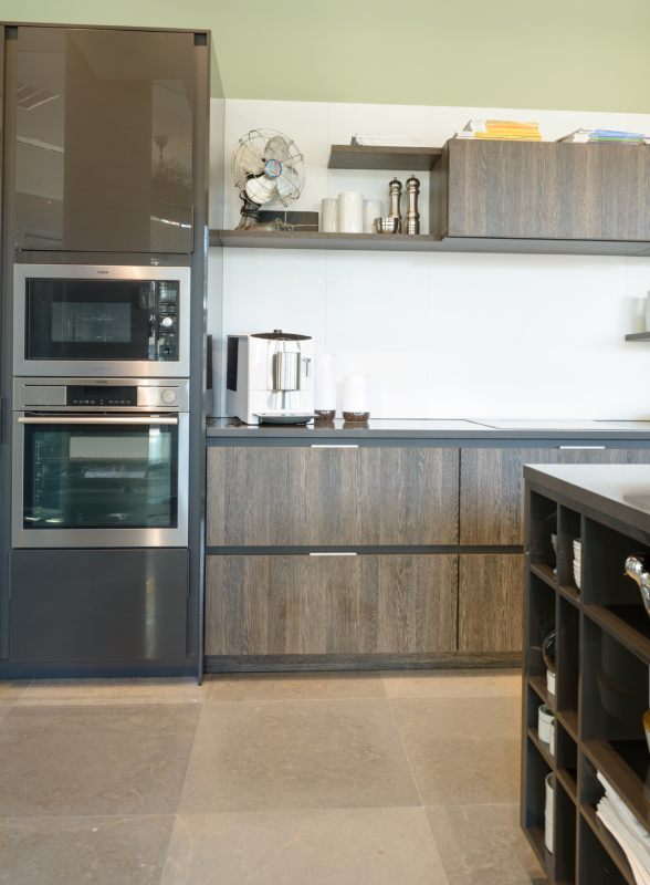 This SieMatic kitchen display offers a refined blend of modern elegance and practical design. Warm Wenge base cabinets pair beautifully with the Graphite Grey gloss pantry, with built in AEG appliances.